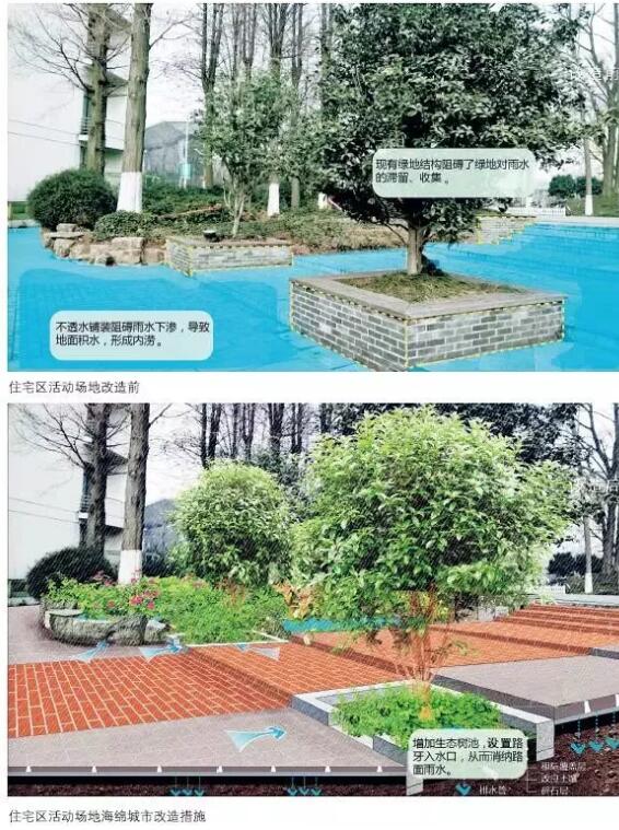 傳統(tǒng)住宅區(qū)中的宅間道路和綠化帶可以改造成透水路面和生物滯留池,用來收集道路上的雨水,避免路面雨水沉積對居民生活造成影響。
